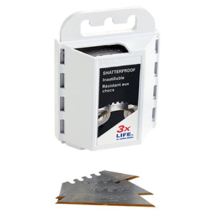 High-speed steel edge with titanium coating keeps blades cutting after others have quit. Patented bi-metal construction allows blades to bend and flex without breaking. Four notch design allows the blade to extend further.