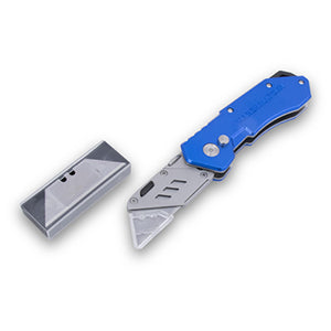 The MARSHALLTOWN Folding Utility Knife comes with a quick change blade mechanism and safety lock-back system. It has an aluminum handle, zinc housing, and a stainless steel skeleton. The Folding Utility Knife includes a belt clip and comes with five blades. Our contractor-grade, QLT Folding Utility Knife has a one-hand opening and closing, one-step blade change, and lightweight aluminum handle.