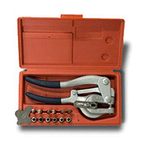 Kit includes: one tool, and one 5/32", 7/32", 9/32", 11/32", 13/32", 15/32", and 17/32" round punch and die, and plastic box